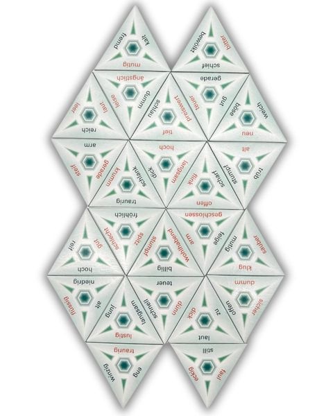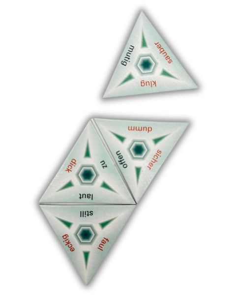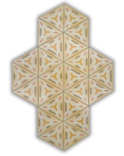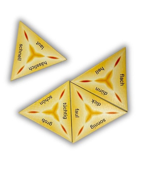 Wenn die dreieckigen Spielkarten so zusammenfügt werden, dass die beiden Wörter der aneinander liegenden Seiten