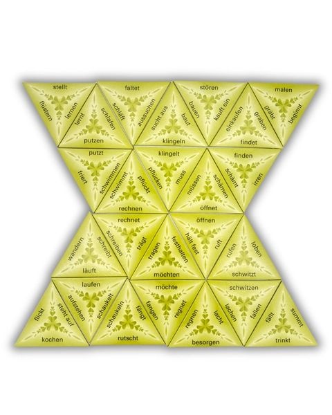 Wenn die dreieckigen Spielkarten so zusammenfügt werden, dass die beiden Wörter der aneinander liegenden Seiten zusammenpassen,