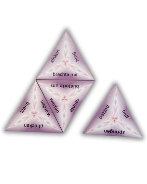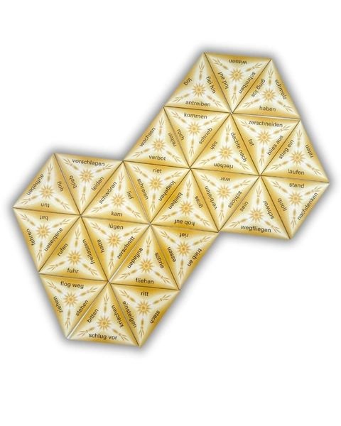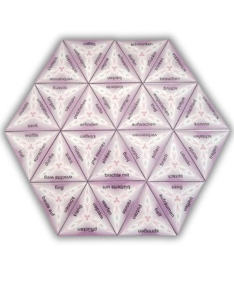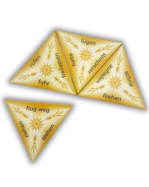 SCHUBITRIX Verben, Präteritum, 6-9 Jahre, Klasse 1/2, Lernspiele für Schüler/Kinder, Die SCHUBITRIX-Spiele erweitern den Wortschatz und üben das richtige Anwenden von Adjektiven, Verben und Nomen. Wenn die dreieckigen Spielkarten so zusammenfügt werden, dass die beiden Wörter der aneinander liegenden Seiten zusammenpassen, entsteht eine symmetrische Lösungsfigur.