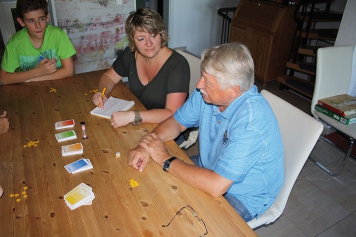 Farbwürfel, Zählchips, Sanduhr, in Spieleschachtel