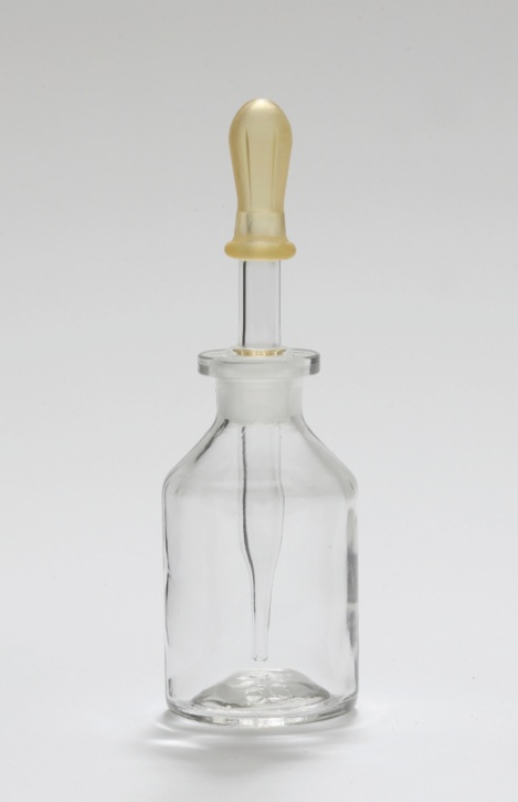 Steilbrust, Enghals mit NS-Glasstopfen, Glaspipette und Gummihütchen