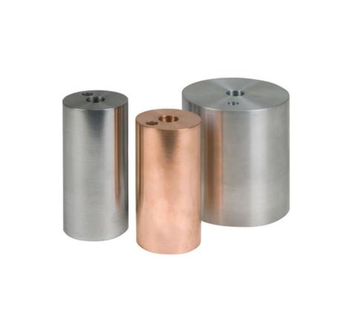 3 zylinderförmige Kalorimeterzylinder aus Metall mit je 1 kg Masse zur Bestimmung der spezifischen Wärmekapazitäten von Aluminium, Kupfer und Stahl.
